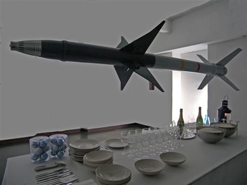 intitolata Ultima cena, compare un missile sospeso a ottanta centimetri dal piano di una tavola imbandita mentre nella performance Piano Bar, l’autore accenna al pianoforte alcuni motivi