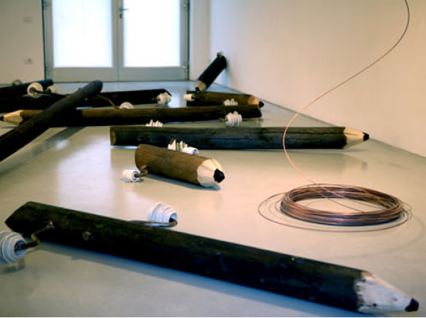 Dodici pali della luce reperiti nella Val Primiero: vecchi pali che danno l’idea di reliquie di un passato andato distrutto e annientato. Hanno ancora i loro isolatori e i loro fili elettrici, ma tutti attorcigliati, quasi a testimoniare che siamo davanti a dei residui usurati, a dei materiali di scarto, a delle semplici spoglie oggettuali. Diego Hernandez li dissemina con apparente distacco nello spazio della galleria, ben attento a non farne testimonianze storiche, rovine preziose, rottami da custodire gelosamente. Egli invece attua sui loro resti una sottile operazione di contraffazione, anzi una letterale alterazione di visione e di senso, trasformandoli in spropositate matite da capomastro con tanto di punta dipinta di nero.