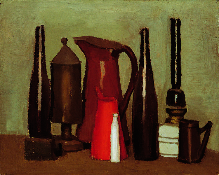 Venti dipinti: le rarissime Bagnanti, cinque paesaggi, un autoritratto, tredici nature morte costruiscono un tessuto che riassume il discorso poetico del pittore dal 1915 al 1960.