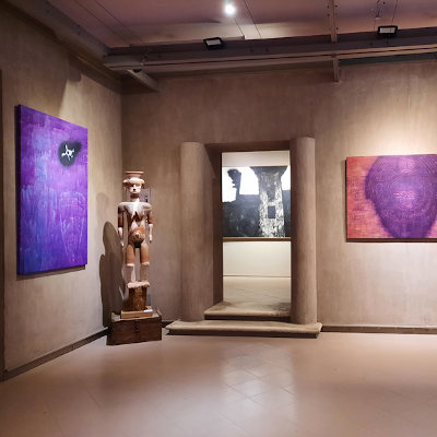 Una selezione di tele di Meloni dai cicli Totem (1994-1997) sono accostate a preziose sculture di arte primitiva per innescare nel visitatore intriganti connessioni tra pezzi antichi e interpretazioni contemporanee, alla ricerca di affinità e sintonie tra artisti appartenuti a tempi, luoghi e culture diverse.