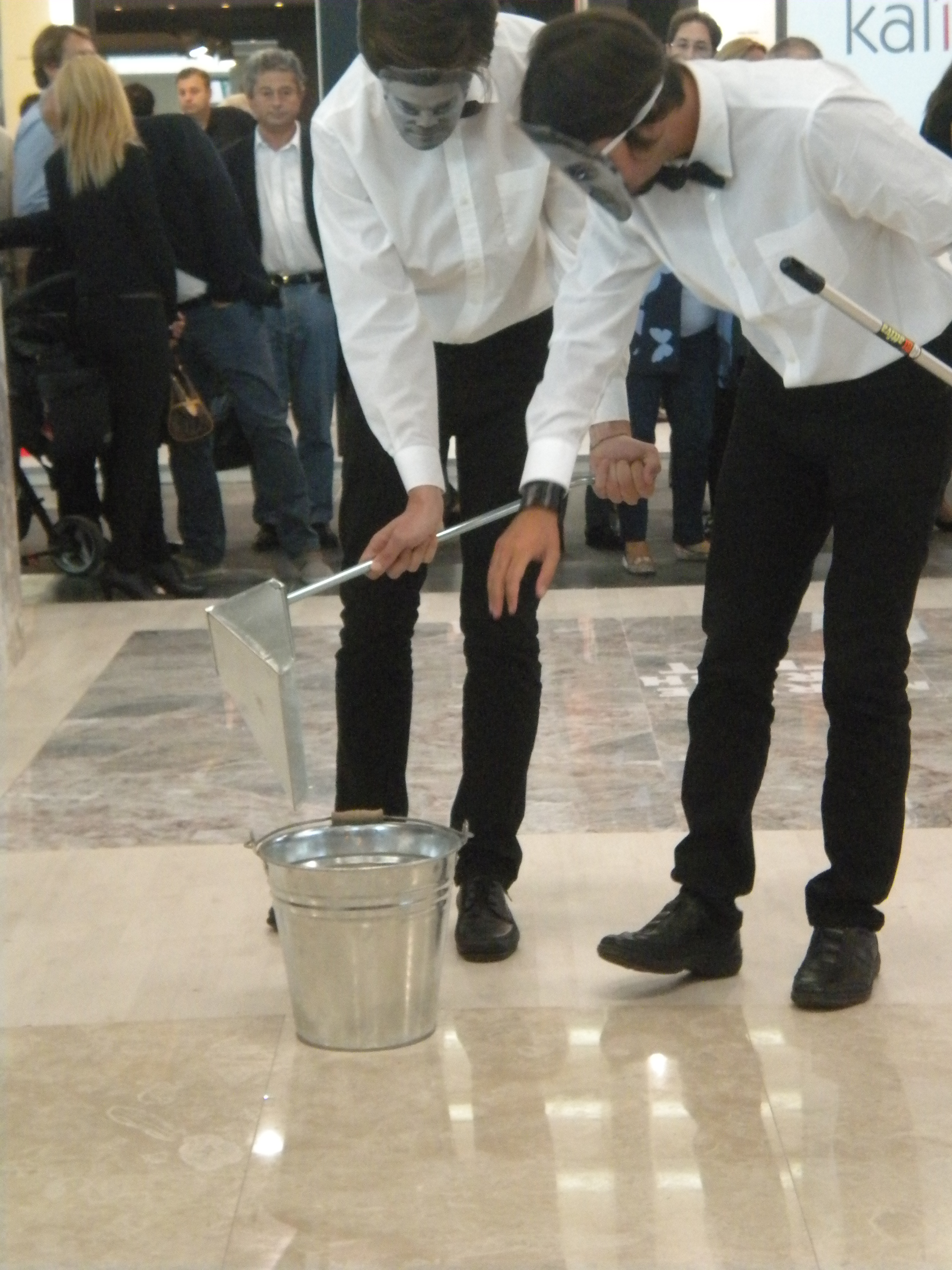 Due dei 3 \"camerieri/attori\" impegnati nella performance